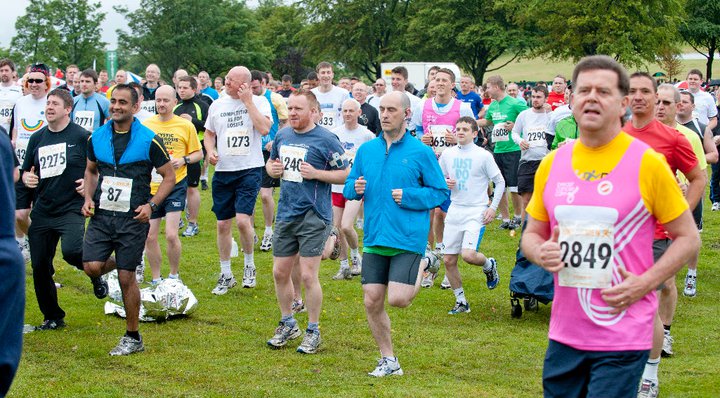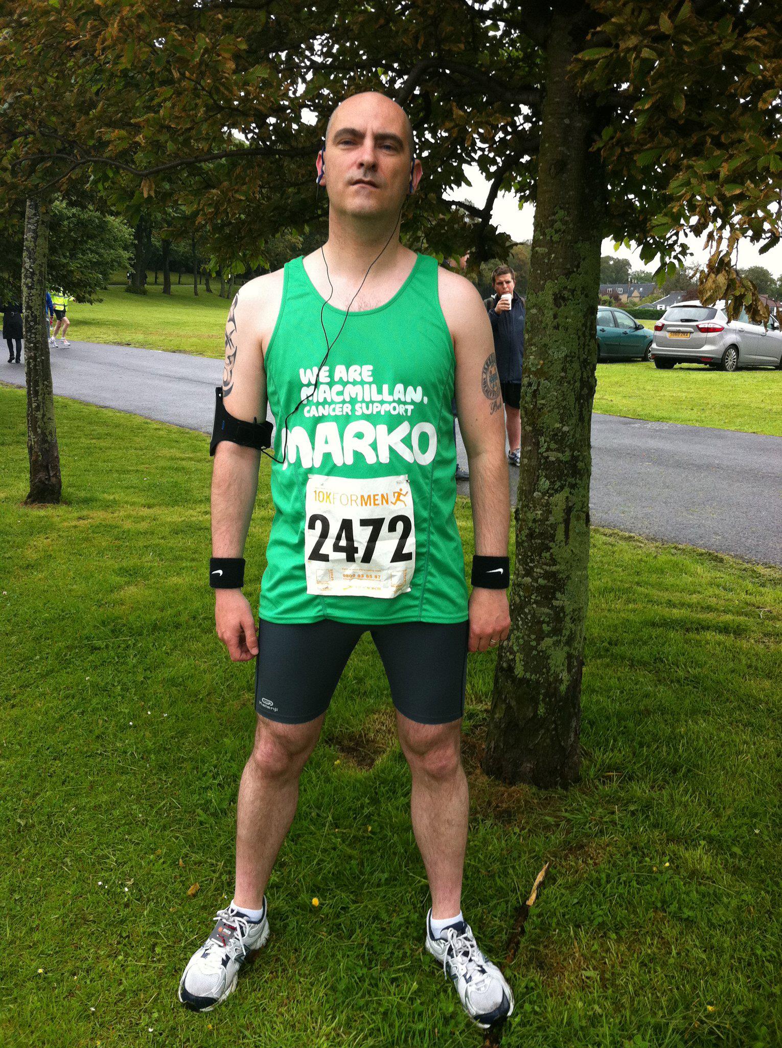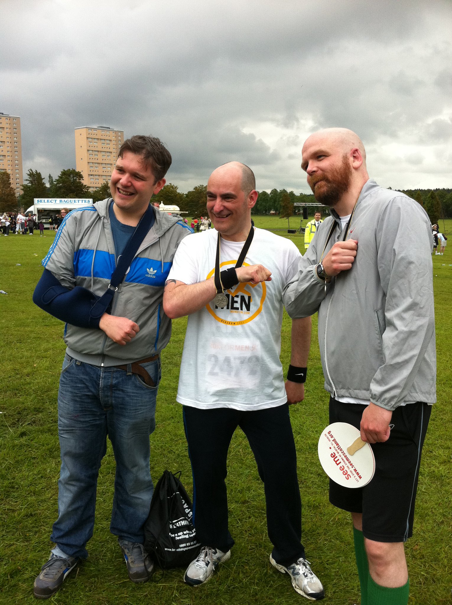 I’ve ran many races you know. Most of them pre my 20s where I probably ran at least one race on average a week. I doubt I was ever as nervous as this, nor did I ever enjoy crossing finish line as much as this. Yeah I won’t keep you in suspense, I made it round. I got to Bellahouston early, we parked about a ten minute walk away and I had a cigarette crouched behind a car so that real runners couldn’t see me. My fund raising had gone well so I knew I had to get round and to add spice to it Producer Jim had offered £50 to the charity of the first finisher from our wee group. Jim himself was going well, Iain the Kinky Wizard was a 7 foot superfit footballer with legs about 1k long themselves, Biffy Kev had pulled out after getting some split ends in his beard, David couldn’t make it as he was practising rolling his eyes and Wolfie was an unknown quantity. Elaine had done everything in her power to make me feel right, I couldn’t even have made it to the park without her support.