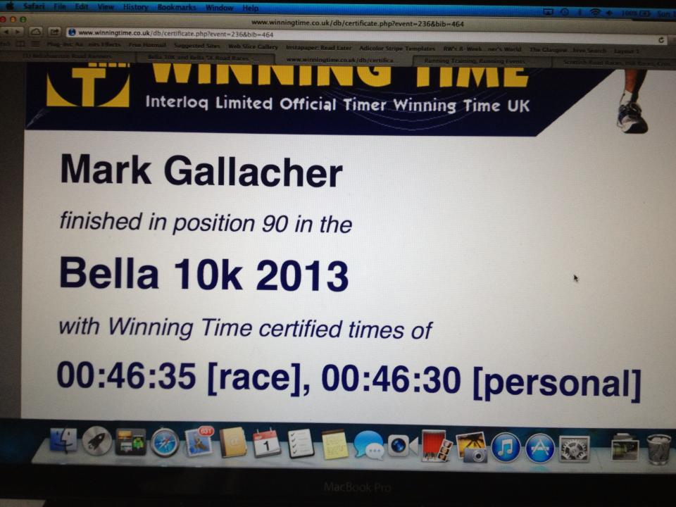 Weight was down under 13 stone and nearing 12 1/2 so was trying hard. I trained on my own knowing I had a 10k in September. I was determined to beat 50 mins at Bella.