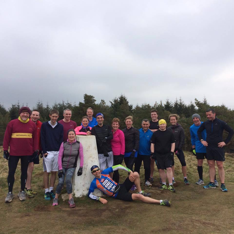 Craig was looking at prospective points on the course to potentially bury more victims while the rest of us were enjoying the views and the banter. Michael Wedlock was making a rare excursion with the riff raff and decided to stamp his authority on the proceedings by sending us up the wrong way over a climb that needed hands to be used to pull ourselves up. We were quickly called back and chastised whereupon Michael blamed Craig and we had our first downhill stretch of the day down to the reservoir. We ran alongside it and then the toughest part of the run a very steep zig zaggy run with almost vertical steps which took us up to the top section and the gorgeous views that awaited us. We had a wee break to regroup and pose for pictures, but only after watching coach John Hughes struggle with technology as he tried to look through an iphone lens to take a picture while his puzzled face was on the on-screen display to the rest of us.