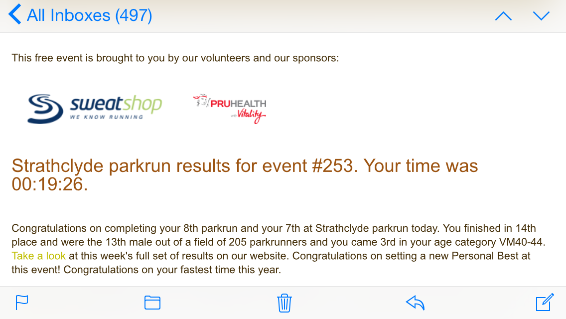 The wind was a bit dodgy through the night, and the rain came but when I woke up at 7 on the Saturday morning it was dry and the wind was relatively ok. I got down to the park for about 8.30 to give myself a long jog as it can take a while for my niggles to calm down. I have to say that since I stopped doing the previous set of stretches etc my problems have diminished by about half! 9.15, time to do some strides and the wind came out to play. Ooft Strathy can be very exposed. I confess that today wasn’t about listening to my body, be that right or wrong. I was after a sub 19 1/2. Ross appeared with 1 minute to go, as usual, and stood beside me to wind me up. And off we went. For that first k and a half the wind was strong, swirling and in the face and to the side. It was tough but through the first 2 in an average pace of 3.53. I needed to run at 3.54 or below to hit 19 1/2. Ross was away from me but I didn’t mind. I was only racing myself today. The next half k to the turn I really found my stride and was going well, we hit the turn and boom! The wind built up like a mad one. I ended that k in 3.59 as i couldn’t stride out and kilo 4, with 3/4 of it in the wind was even worse at 4.05. With a kilo to go I was at 15.51. I was going to fail unless i could find something special. Thankfully the wind eased off and it was that long run for home. Ross wasn’t that far ahead and I passed a couple of people. I gave that last half k serious laldy and threw myself at the line. A final k of 3.35 and time of….. 19.26. YYYYYAAAAAAASSSSSSSSSSSSS!!!!!!!!!!!!!!!!!!!! Grasping victory from the jaws of defeat. 3 PBs in the one week, and all at Strathclyde Park. I think it now gets renamed after me.