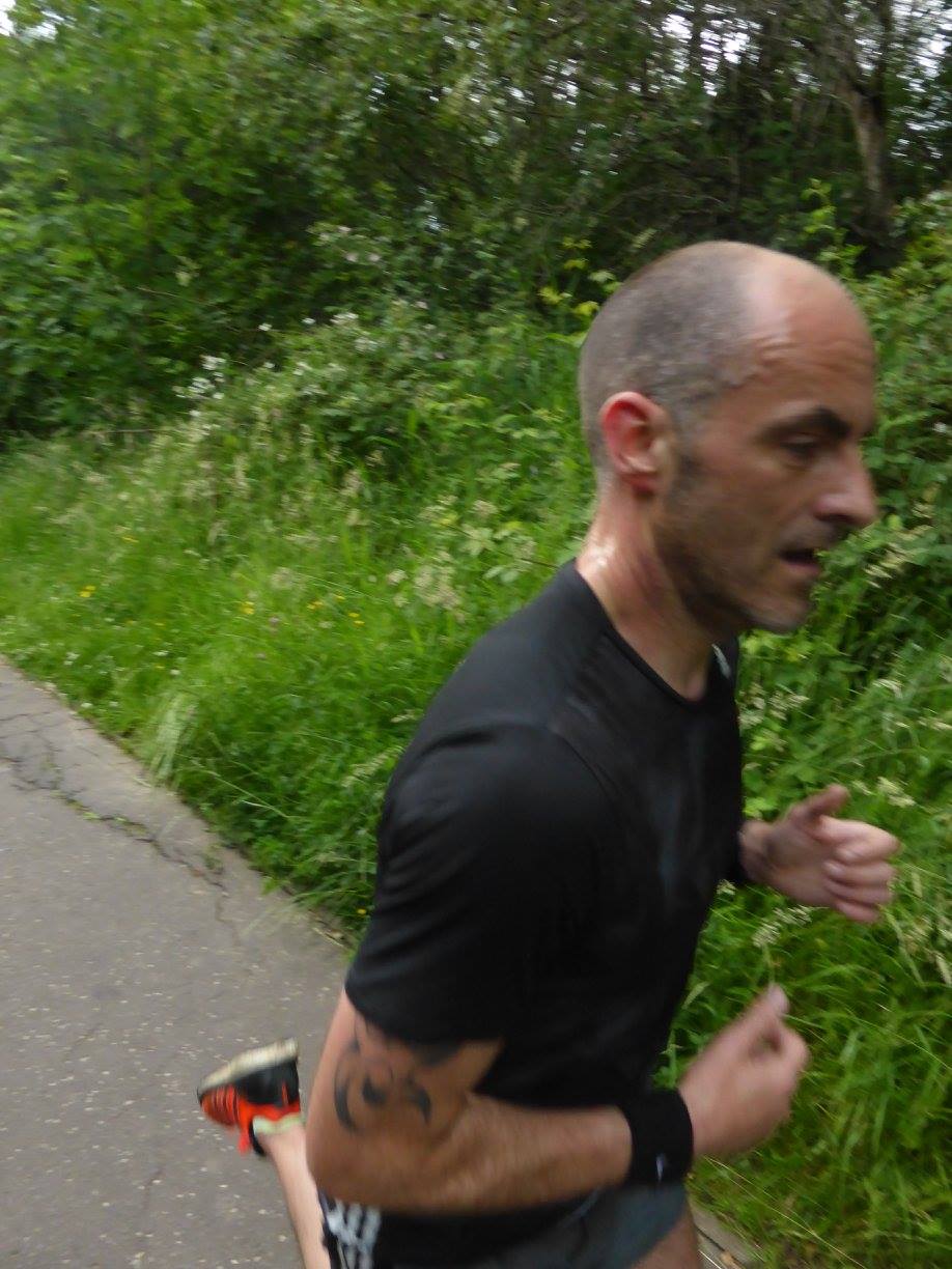 Off we went on a clammy night and my GPS lost it’s signal…. ouch… the doubts started creeping into daft wee baldy’s heid again but I kept going and it came back on after about 3/4 of a k. I was fine. I decided to just keep looking ahead, not behind and what would be would be. I kept my head and my pace and strangely no one went past me. About halfway I actually started to pass people and with about 2k to go I did look over my shoulder and saw Mark P getting close to me. Nothing to be ashamed of, he is a phenomenal runner. Andrew’s shots from the hill with about 1 1/2k to go show how close to me he was .