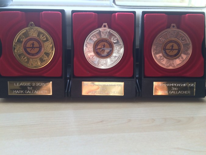 Dumfries half marathon was next and I wasn’t training. A couple of small runs. Unfortunately for Jim he pulled up the week before it and wasn’t able to run. I got myself round stupidly, 1 hr 42mins of back pain and while I enjoyed it I regretted it straight after. The pain was bad but I enjoyed the effortless wander, and I was in the driving seat again. (https://markgallmac.wordpress.com/2015/09/22/let-it-happen/). Tollcross parkrun and again on no training and on a cocktail of drugs I was able to run steadily up and down the hills and finish not far behind Clare Hughes in 20.45. Way outside my best but enough to clinch the title. (https://markgallmac.wordpress.com/2015/10/04/on-the-road-a-personal-review-of-2015/). 57 points out of a possible 60 despite a few races lame, so I can’t complain. I am delighted to have won this, and for Jim in second who shared friendly rivalry with me over the summer, but I will not do anything as stupid again. Maybe I would have got injured anyway, but I did not do myself any favours. I was also fortunate that I finished 3rd in the overall male title. This was without any concerted effort, apart from running the Lanarkshire road relays when I realised I only had to get round it to clinch my medal. Almost cost myself it without realising it by jogging at Dumfries, but it’s a bonus at the end of the day, but one I am pretty proud of. I was actually in level second until the last race of the season at Strathaven but Nick deservedly took the spoils here while I sat eating chocolate and feeling sorry for myself. I like chocolate.