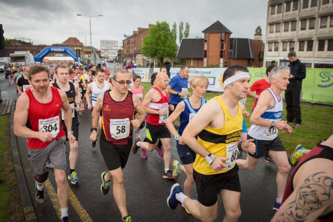 Now I know it’s not words that you would normally associate with the wondrous place that is Clydebank, but after last week’s Heat Hell in Helensburgh a Cloudburst Carnival in Clydebank was lying in wait. The M8 was crazy, crashes everywhere as the rain lashed down but got there in good time in order to get properly soaked before the race. Arthur promised me it would stop at 7.10 but I wasn’t for believing him. Blog titles already milling around. “Only happy when it rains.” “William, it was really nothing” (the rain falls hard on a humdrum town…..). Sure enough though, just like last year the rain stopped just before race start and stayed off until the run was over. The Polaroid witch doctors dance working for the punters, so having turned up just for a Meh sort of run it was suddenly looking like it could be a good evening for a run.