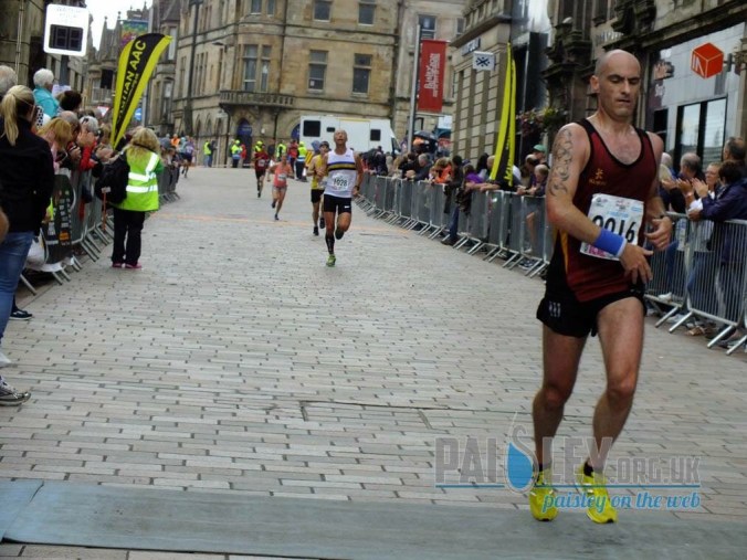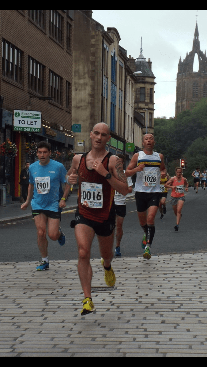 So plenty of pics in the first 1 – 2 k and then we headed out the centre, so unsurprisingly the photos dried up. I was toiling into the wind and my pace was slowing. Expected. All about screwing the nut and maintaining a steady pace. Any outside thoughts of challenging a PB already gone as we went past St Mirren Park, that haven of sporting achievement and the home of free flowing “getting gubbed “ness. I felt I was running slower than Barry Lavety with a pie supper but wasn’t going to chuck it. Through Feegie Park and I was joined by a wee dog, a Staffie or something, running at people’s legs. Then onto the road into oncoming traffic, then back at the runners again. It seemed to be with us until Linwood. Through 5k in 19.45 so only realistic aim now to maintain it, get the sub 40 and a course PB. Having run a couple of k on my own I was happy to catch up with a group again as we headed to the incline to the canal, the little swine that it was. Once up there I knew it was an undulating slog along for about 3k then up to the finishing k, so tried to go as steady under 4 as possible. Came alongside Bella RRs David Hulse who encouraged me as I went past. Seem to know more Bella RR runners than MAC ones on Strava these days, maybe a free transfer in the offing. After what seemed like an hour on the cycle path we came off and I knew it was just the small climb up Lady Lane then 500m or so downhill to the finish. Was getting more into the run as it went on and could see Kilbarchan’s Ryan Waldron just ahead who I have been seeing the back of all season to be honest, so my run had obviously picked up. With cheers from Ian Goudie at the bottom of the climb and from the Henry Merriweather’s Bella squad at the top I wasn’t far from home so tried to get as steady as I could the last downwards stretch to the finish.