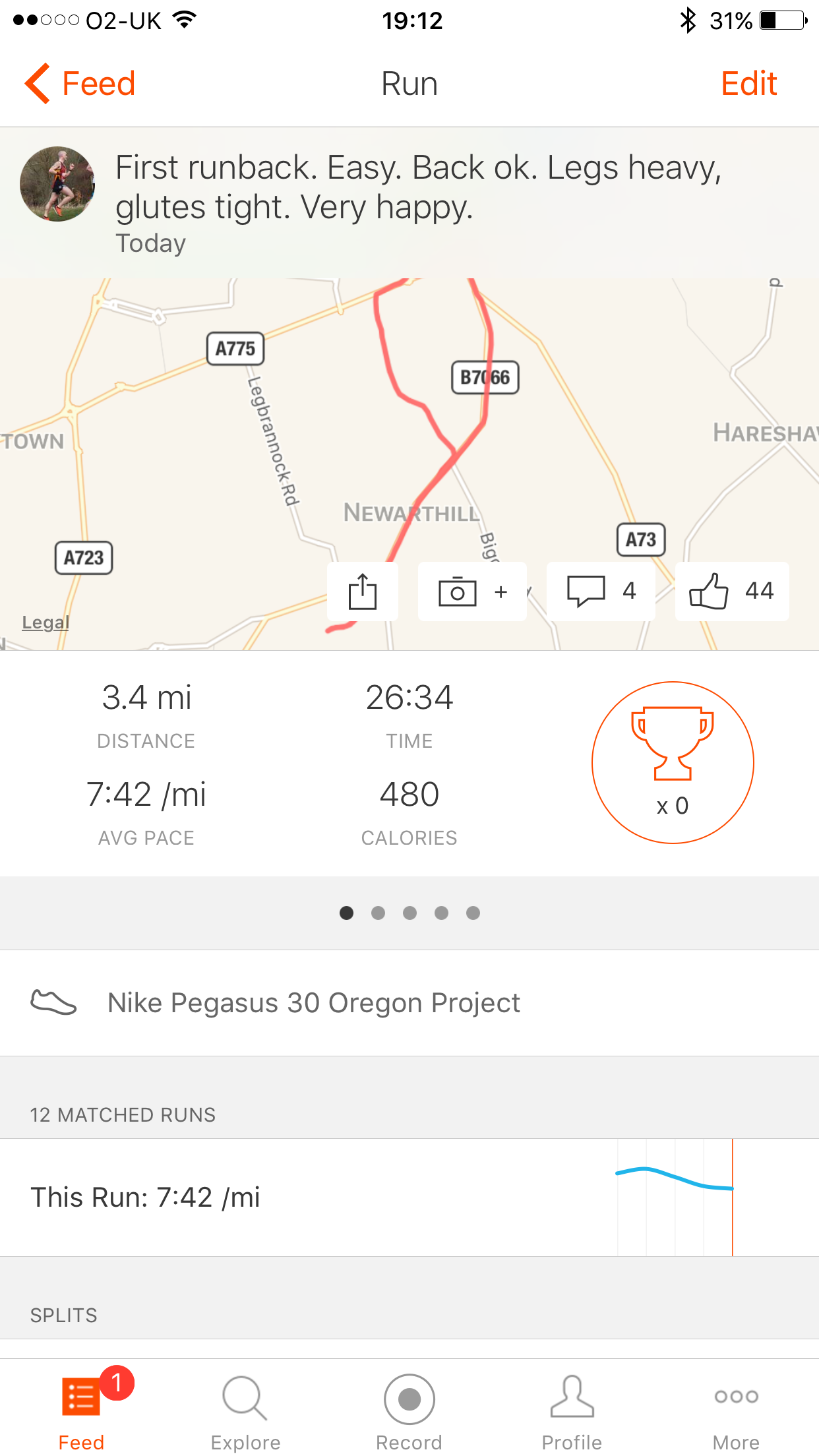 So another week gone and I know things have felt better over the last few days so the plan was to try a wee run this weekend. About 4 this morning I woke up. No back pain. Yeah was going to be today I tried. So I was even more restless. I’ve missed it you know. Tossed and turned for a while. Eventually got up. Elaine sleeping so the search for clothes in the dark. Downstairs avoiding hungry meowing cats. Cereal bar. Energy drink. Search for the Garmin. Find the Garmin. Charge the Garmin (oops). The gear on. Trainers tied. Wait for signal on the now partly charged Garmin and out the door. Sun actually shining. Through the gate into the park and a wee jog. Past last weeks stopping point. Back feeling ok. Legs heavy. Glutes tight. Ach I’m old, that’s ok. Running ok. 1k uphill done. 2nd k uphill done. Back still fine. The fog of the last few weeks clearing in my head. Smile at a barking dog. Cross road from barking dog. Last wee uphill bit. Past the Newhouse and a few k back down. Feeling good. Great to be out there. 5k done in about 24 mins odd. Last wee bit to the house through the mud in the park. Finished.