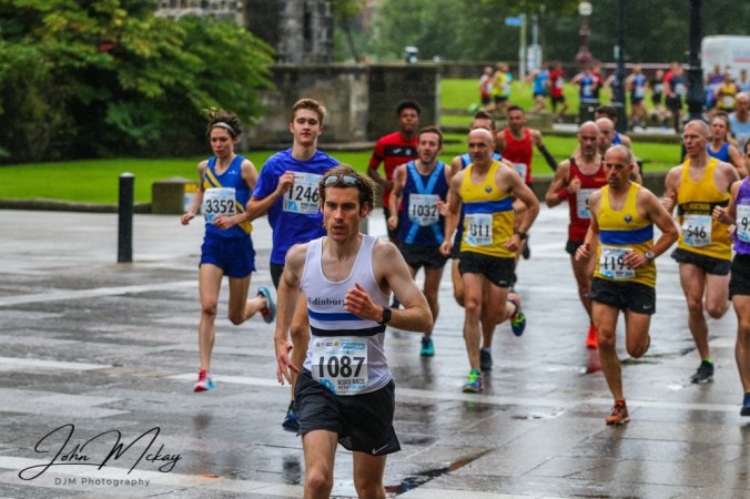Again it struck me that we are all human, some of us may find the wind tough, some of us may find it ok. I felt fresh and as we got to the climb up to the cycle path I went for it. I overcame my fear and went past Jennifer. I passed a few folk and was on the cycle path of doom, passing people then a gap, the next one ahead was Brent. Again I was worried about taking him on but decided to be strong. He saw me and moved to block me, the track runner in him coming out. Missed a photo from Kev Queenan as I couldn’t get past. Waited, switched sides then decided to go for it. I was handling the cycle path. Another quality runner in Central’s Fanni Gyurko wasn’t far ahead. People like this I don’t get near often so as we left the cycle path and into the last mile I tried to catch her. Up Lady Lane and I sneak past on the inside. 1k to go, wee climb then a fast finish on the slippy cobbles. The dander was up, I was running freely, confidently.