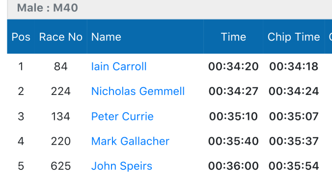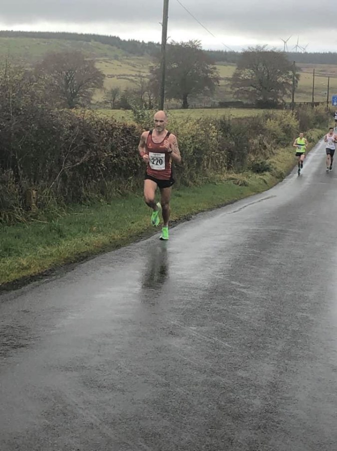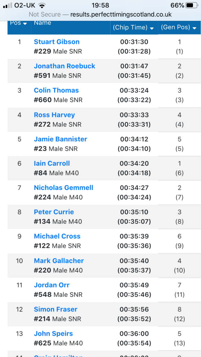 James from Ron’s Runners was indeed on the way to a PB but was struggling on the climb having been a long way ahead of me. The wind had really come out to play and was against us all the way up and would remain like that until the finish, it was tough to be honest, I won’t lie, but I was running steady, it was just like a Sunday at the transmitters. I was exposed in the conditions and on my own so set about trying to catch the group ahead which was led by Jordan and his team mate Michael who had been ahead of me at Vicky Park when I did my 16.57 so a couple of right good runners if I could latch on. Took me to the top of the climb but I got there and then there was 3 or 4k of right good racing. I’d try to push on and Jordan would be back, or Michael would or LTCs Craig, good honest racing and pacing. I was aware of a group close behind too, I had no doubt Speirsy would be there so despite there being a hill with 2 k to go I took it on. Pushed up the best I could then over the top, a mile to go. I wish I had been a good descender but I’m not. I’m running honestly at the front, but I can’t break the cord, hearing the breathing behind me. Round the corner at 500 to go and up the hill, Michael on my shoulder, Jordan right behind. Onto the grass and the long muddy run for home and Michael takes the sprint out. I react and am back with him. He goes again, then I draw level again, he goes again and I just can’t quite match him. We are both slipping in the mud, must be funny for people watching but he just nips in front and stays there until the line. I’m through in 35.37, 10th place, and a second behind him.