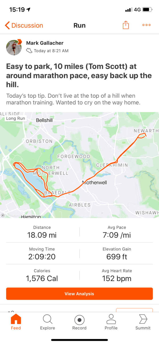 Sunday was another dreaded run on the road to Manchester. 18 miles with 10 at marathon pace. Wee run downhill to Strathy then did the Tom Scott 10 mile route. Windy but held it together and hit my aim, the ten miles in around 66 minutes. Kept passing Darran Muir and James Gillon who were running in the opposite direction so had to do that thing where you try and look easier than you actually are until you are past them, you know like the typical Scotsman on the beach abroad sucking in his belly when good looking lassies are nearby? Aye that. Got kudos from Darran on Strava so must have worked πŸ˜‰ The run home back up the hill for 4 miles? Not as nice.