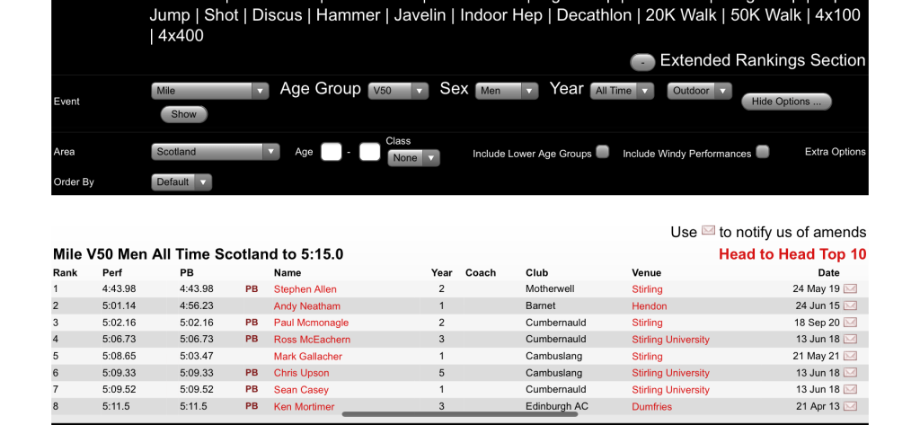 Edit to add: amusingly Power of Ten have me now as the 5th fastest all time M50 Scottish athlete over the track mile. Accurate? Of course not. Funny and responsible for putting a smile in my face? Oh aye 😂