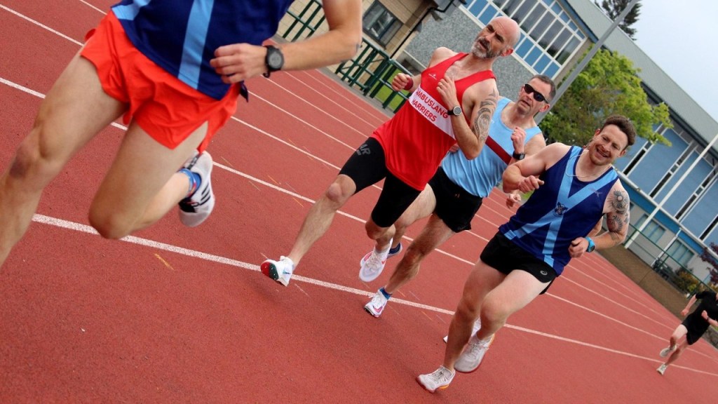 A big thanks though to my track training squad who kept me going through this even though we couldn’t train together until April, but a great group to be a part of, I can’t put into words how much these guys kept me going. Aye we haven’t had much chance to really do anything but I was given a purpose, a kick up the arse, some good craic and some pointers on how to improve my track running. They laugh when I say it, but I do look up to them and if you can enjoy it while training hard then for me what else do you need? Now it was coming too soon but the Monument Mile was a month away, too soon to do any damage but it was an aim, focus and purpose. I still felt that I could get near 5 minutes after my 5.03 of 2 years ago and 5.07 on the virtual road last year. Not as fit but I was getting there, my general endurance is decent and my speed improving and I think I am training wiser. Back to the club as well so a chance to improve my speed endurance but only a couple of weeks of that isn’t going to make a big difference to be honest. It was coming 3 or 4 weeks too soon but wee Forbesy had me grafting, 400 reps, flat out 300s and 600s etc. He was destroying me. But great fun. We all knew the mile was coming too soon but we were enjoying seeing the week on week improvements as we headed into what we hoped was going to be a season. The week before the mile we were fortunate enough to get invited to Bellahouston Harriers invitation mile and gratefully accepted to let us know if we were able to handle the distance or not. Nerves? Oh aye. Kicking in. Hitting harder than a tackle from Billy Abercrombie (told you I was old). GG had picked up a wee niggle but myself and the two Pauls agreed to take a lap each around 79/80 and see how we felt for the last lap. And you know something? It went to plan.