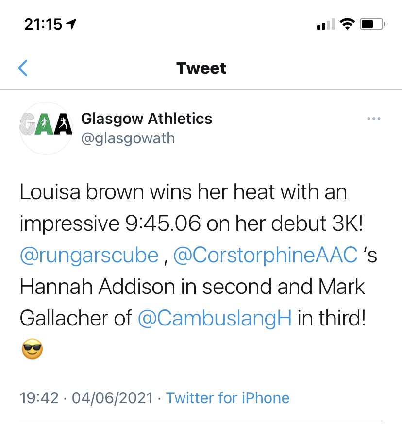 Apologies to every one that was there, I confess I was hyper. I was excited, delighted, ecstatic. I must have seemed a right wee heid nip. When I joined Cambuslang I told Captain Richie that I believed I could get down to the 16.40s with a bit of hard work. Don’t think he believed me to be fair 🙂 But I had went under that, I had worked for it, mentally and physically and got what I thought I could do. Two fast 5ks (for me) now, and what a difference from the 3000m. From one to another but with massively different results. So a big thanks to Forbesy and the gang, you don’t know the difference you have made to me, and to my squad at Cambuslang for kicking my arse on those tempos and teaching me how to float between efforts. I’ll never be any kind of world beater or anything resembling that, but for the first time I have started to realise my own potential and at the end of the day that’s all we can do and I feel brilliant for it.