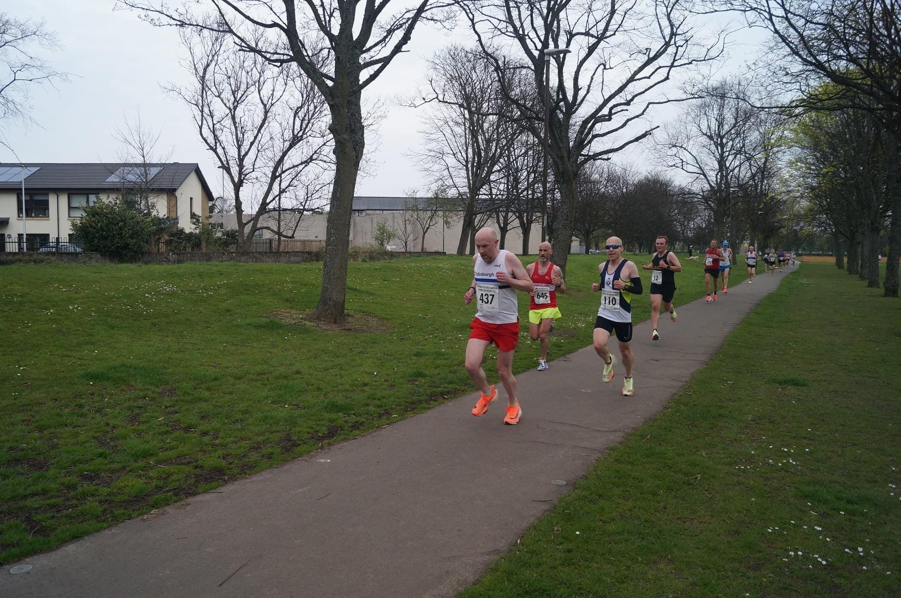 I was honest to people. I have no idea how I could do here today. I’d managed a semi decent 5k, then did a semi decent 6k in the last few weeks. A jump of 4 k is a lot. To be honest I thought sub 38 a realistic target but didn’t know how the legs would be. I’d be happy with a time starting 37, but was going to go out at 36 pace and see how long I could hold on for. No pressure, if the legs go they go, I won’t be letting anyone down, including myself. We are offski and the first k as always is quite sharp, probably too sharp for me so I calm it down and I am soon running around 36 minute pace and although it’s a tough pace, I am relatively comfortable. People are passing me but it’s fine and soon we forming groups. Beside and just ahead of me are some familiar faces, Dan and Lesley from Garscube, Chris from Calderglen, my team mate George, my pal David from Pitreavie along with some fine runners from Edinburgh and PH. This is a sub 37 group if not faster, try and stick in here as long as I can. We take the turn through the first of the parks about 4k in and I am finding it tough. Lesley has pulled away with the Edinburgh contingent and Rab from PH (who had finished one place ahead of me last time here) and David is almost breaking the elastic but I am trying to hang on to him the best I can. 5k beep on the watch and it’s around 17.50. This is not at all bad. Better than expected. Sod this I’m going to have a wee race.