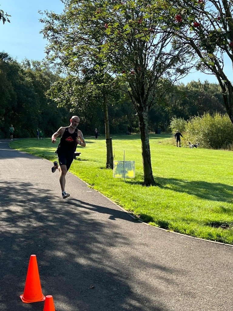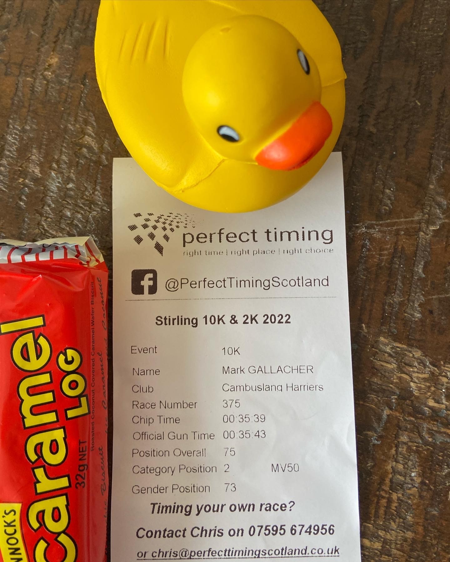 The racing was really good fun, the head and the legs were active most of the time, and I have shown good consistency. I even lost the sweatiest runner competition, a celebratory hug from PB smashing PAACE legend David leaving me as if I had wrestled with Rebecca Addlington in a paddling pool.* Maybe I will never get near that PB again and my ambitions were too lofty, but running regular sub 36s at my age is something I can be really pleased about, and it was certainly much better and much more enjoyable than my last 10k at the Brian Goodwin. So what’s next? Cross Country trials next Saturday but since the uneven surfaces would probably play havoc with the calves I’ll probably miss it, but I do have another couple of 10ks coming up that I can hopefully enjoy again then it’s head down for the winter. Big thanks to Lewis and his team for a well-run event and for the rubber duck, though Jon has already pinched it. Big thanks to Iain at Cambuslang, Graeme Baxter (G-Bax photography), David Murray & Drumpellier parkrun and Aaron Gabriel for some cracking pictures.