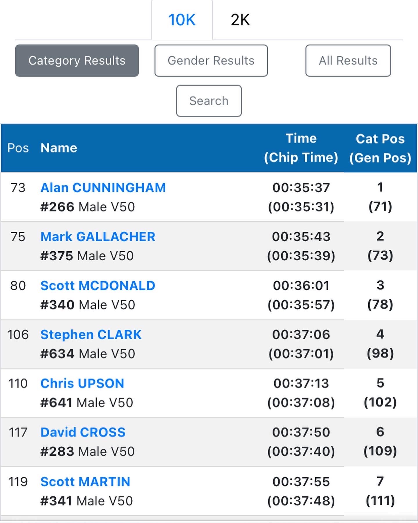 Last k and was able to up the pace and was fortunate on this occasion to pull away from Scott but was never going to catch Alan as he finished 6 seconds ahead of me and I went through the line in 35.39, equalling my best of the season, and a course PB by over 3 minutes. I have to say, I really enjoyed this one.