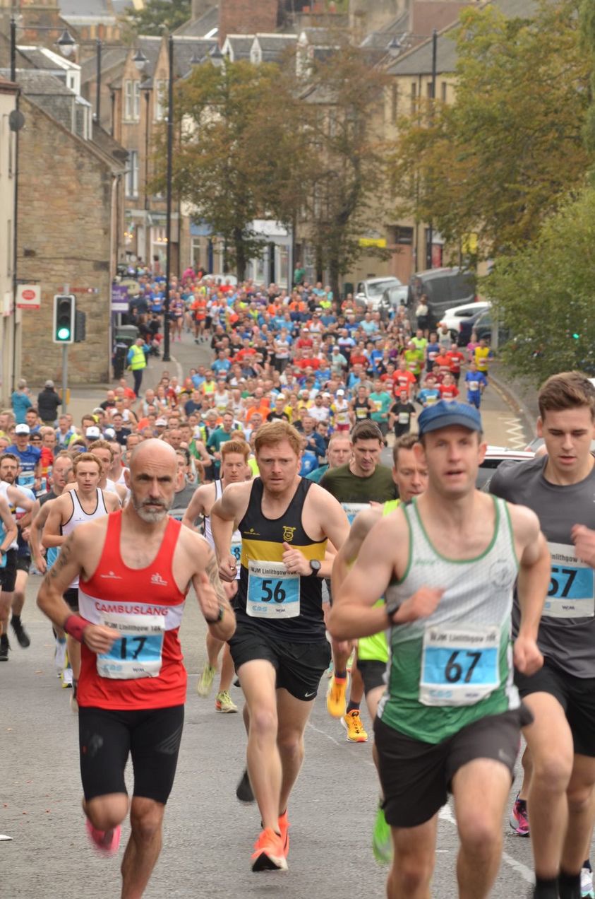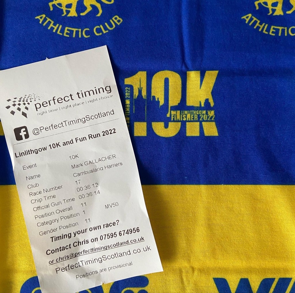 What a buzz and lift from that but now onto the actual running. The next weekend was to be the Linlithgow 10k. I had run it the year before being fortunate to take the M50 title. It’s a tough, tough course, I think the only flat bit is the bit where you pick up your t shirt at the end, but it’s an enjoyable one. I know, I’m not sure how that one makes sense either but it’s a “get out there and race” one as times aren’t as important. It’s good to have races like that. OK, times are still important, but only really as a comparison against times on the course rather than against PBs, and having run 37.45 last year I was wanting to try and beat it this year and maybe even go under 37 if all went well. Nearly a minute is a big ask, especially with the wind coming out to play, but why not? The 50s race was looking a lot more stacked this year, Stuart from Perth there who I had never beaten before, Steve from Fife again, so hopefully I could get myself dragged along a bit like I had been at Stirling. Alastair Hay away like a rocket from the start looking for something like his 87th consecutive win (which he got) but I was just trying to keep myself as far up the field as I could and get round in a good pace.