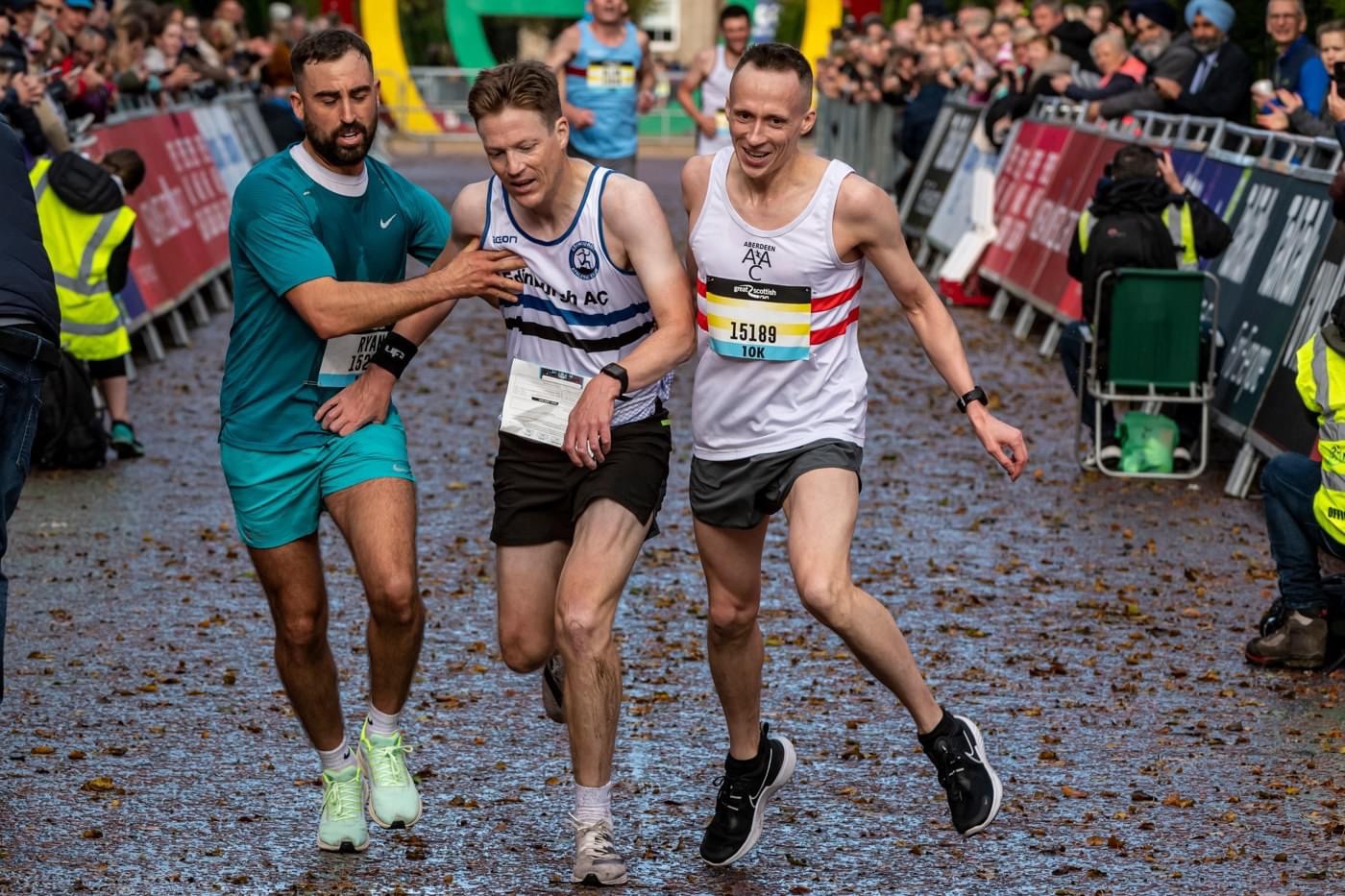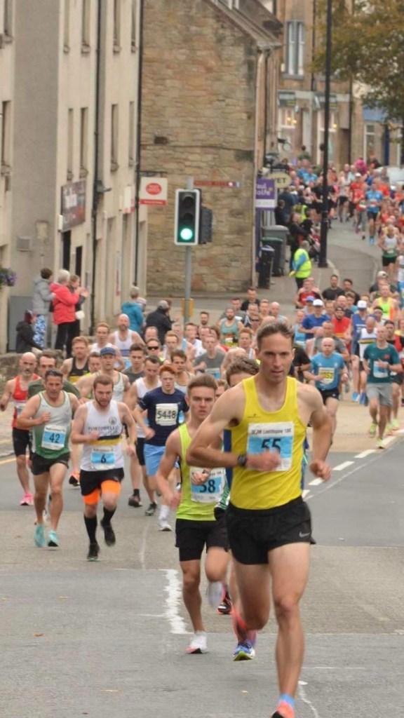 Some very decent 50s in the pen. Stuart again, Michael from Edinburgh who had beaten me twice over 10k already this year, my ex team mate Cammy who is getting sharper every week after an injury break. Joking with John from Airdrie about making sure we get a signal on the watch before the start as mine drops. It didn’t come back prior to the gun. Ooops. John was worse though, and the shout of “Aw f@@@ I haven’t started my watch” as we went over the top of the first hill gave me a wee chuckle whilst we ran past a choir singing “Super Trouper”. Brilliant. Stuart and Michael were piling on the early pace but while I was a wee bit behind I was controlled and relatively comfortable. I was in a groove even though I still had “troopapa troopapa” going through my head. My GPS was coming and going so I couldn’t trust the watch except going through the k markers. Through the 5k timing mat in the low 17.50s I’m feeling really good. It’s basically flat to the finish, the wind is going to be behind me, I have targets in front of me, let’s do this. I can’t emphasise this enough, for me I’m running well, I can feel it today. You know those ones where the stride feels effortless even as you pass people? It was happening for me today. The 50s race was on, I am within touching distance of Stuart and Michael who are racing hard.