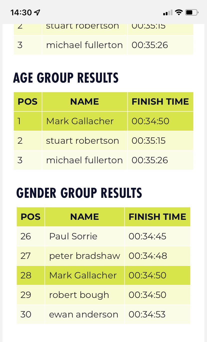 It’s still at 34, and it still was when I finished, getting over that line in 34.50, a course PB by 3 minutes and 36 seconds. Everything given there, and not just by me. Behind me Stuart and Michael had kept their battle going right to the line. Michael had made a late break over Stuart and having given everything he wobbled and collided with a barrier, his legs totally gone as he was helped over the finishing line by two fellow racers, great spirit from them, still running a season’s best with Cammy right behind him.