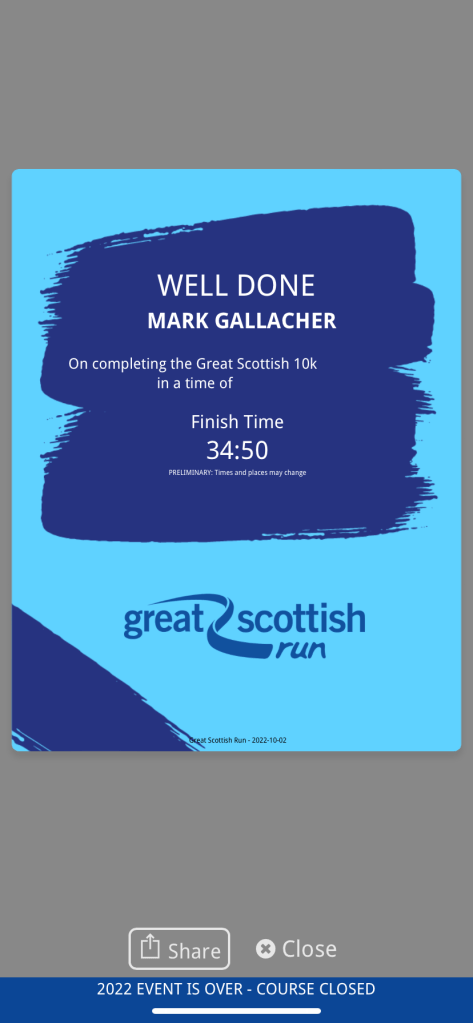 EDITED: On the 19th October Great Scottish Run announced that the course was short. I kind of suspected that. Had the distance been correct I would still have beaten my PB but it now won’t stand. This is not acceptable to have happened yet again at the Great Scottish Run and to offer a 10% discount on an extortionate race as an apology is quite frankly an insult. This situation is not acceptable. Support your local and club races because these big events frankly are a waste of money with a lack of regards for the runners.