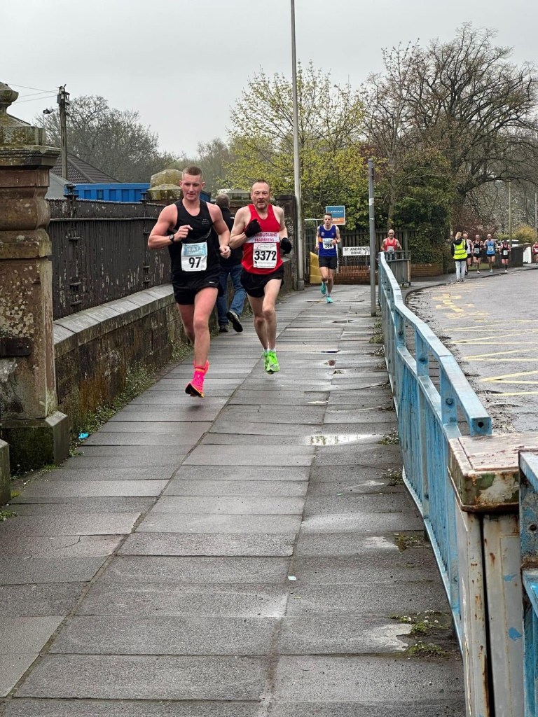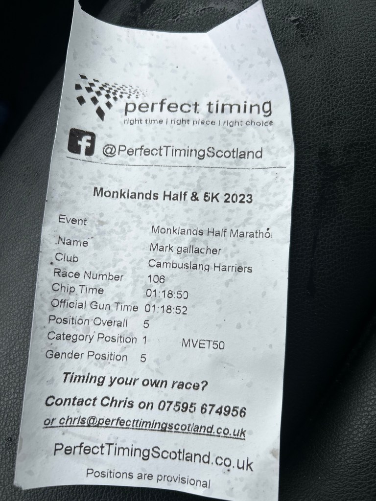 Was happy to settle behind the group around that first loop in about 15th place or so and once we climbed up the hill at Bargeddie for the first time I felt ready to kick on. Through 10k and feeling fine in about 1.21 pace, so time to stop letting people go by and time to start upping it. I reckon I was sitting about 14th or 15th as I came through the park to the end of the first loop so there were people strung out in front to go after. Let’s see how the legs are. Over that last loop I picked it up and finished well, came round the finish straight and saw 1.18 was still on the clock so kicked to the end finishing 5th (and first M50) in 1.18.50. For the 3 rd race in a row a very pleasing negative split.