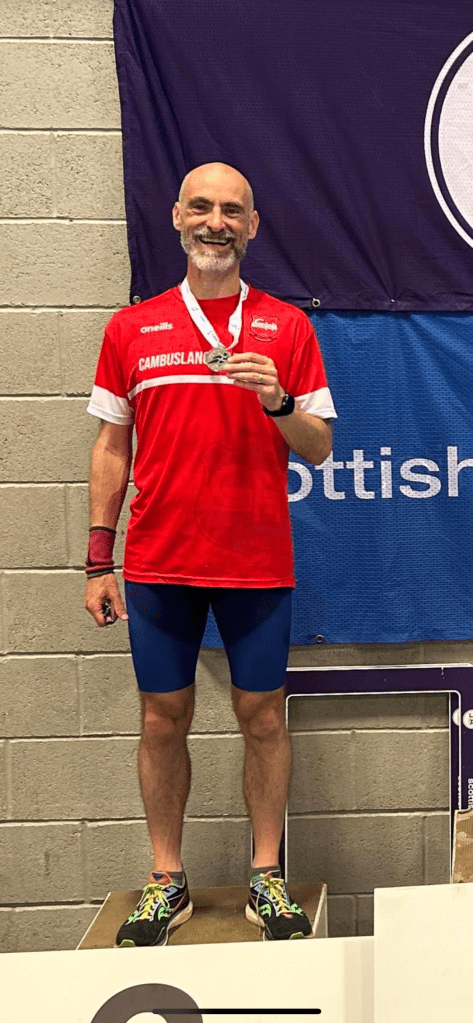 All about Sunday now. Did I feel in superb shape for the Scottish Masters 5000m champs? To be honest no. Looking at the starting List I was 5th fastest this year so there was nothing to lose, and nothing to stress about. I would be happy with around 17.30 but had half an eye on my track PB of 17.08. I knew if I wanted to compete for the medals I would have to be around there but didn’t really expect to be able to do that. I didn’t fear blowing up though. It genuinely felt good going into a championship track race knowing I wasn’t a contender, because the previous two years had been all about that. I won’t lie, I did have a gameplan, and no I am not going to tell you what it was, but here we are now about 9 ½ laps in, with about 3 to go and I am sitting on the shoulder of second, with a buffer over 4th, and on PB pace. I feel that I have enough over 4th that if I go for 2nd place here and blow up I should hopefully be ok to still finish in bronze. And I go for it. And the legs remain intact. And for the first time since the marathon I feel strong. At the bell I know an 80 last lap would bring me in sub 17 and give all that I have. I finish in a 16 second track PB of 16.52 with a national silver medal.
