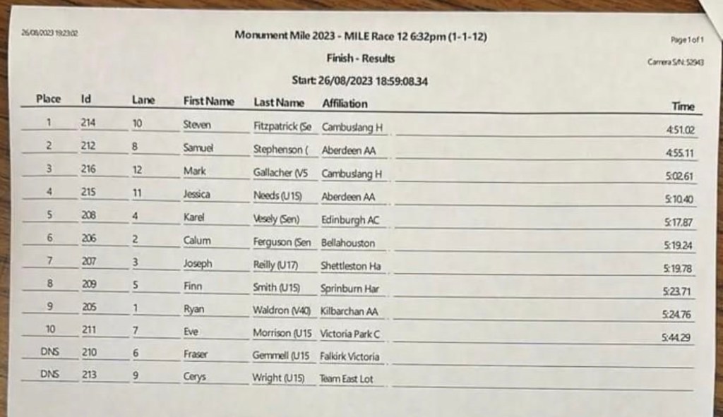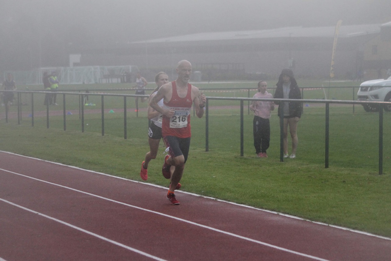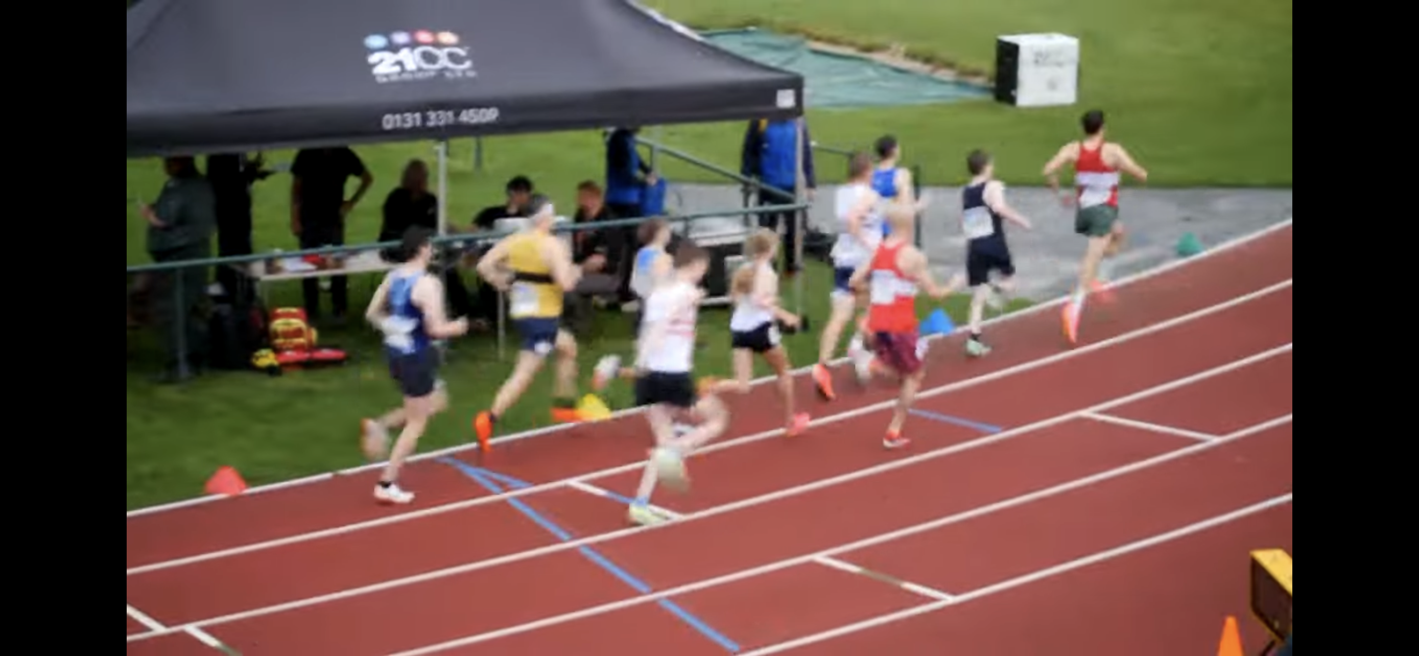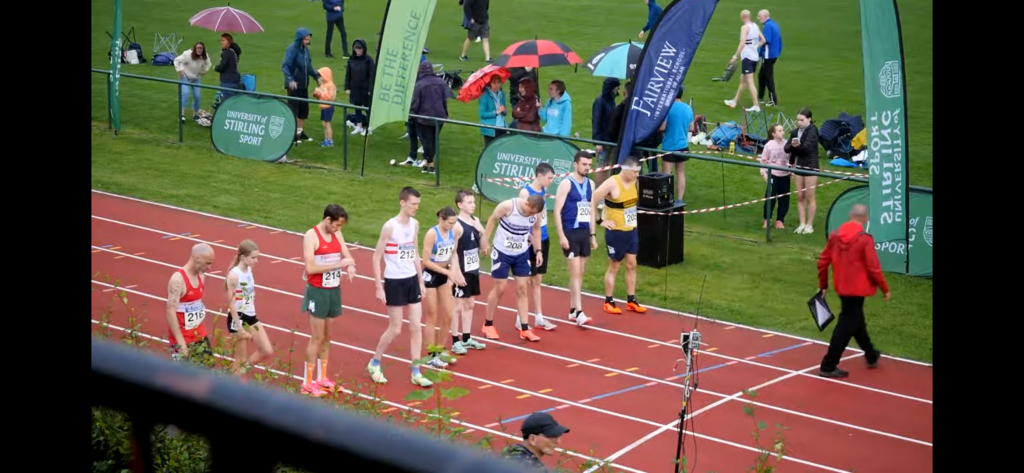 Conditions were mixed. There was no wind and it wasn’t too warm but the early shift had attracted the rain and I was drookit before we even lined up. Being held on the starting line whilst the photo finish set up was rebooted didn’t help either and seeing that the lap clock wasn’t working either wasn’t going to help but these are all just wee annoyances rather than anything. I wouldn’t say any of it affected my run and I certainly wasn’t going to blame my sore throat either unlike a young Norwegian with better hair than me. I’m ranked the big outsider and start way out in position 12, and by the time I get to the inside after the gun goes Fitz is already away and has taken a couple of others with him. Am I being tactical hanging back? Conserving energy? Nah simply don’t have it in the legs, no excuses. Three away, the rest of us packing and I’m at the front of the pack pulling them along. Not what I wanted to do. Through the first lap and I have no idea of the time, the clock isn’t working and the crowd are that loud I can’t hear what the timer is shouting. All I can do is try and find a groove. No one is going to help me and the other 3 are well away. Fair enough but I have no real idea of my pace. Through 800 and 3 still away, and I have shed my group with the exception of Jessica of Aberdeen who is matching me stride for stride. I *think* I hear a split of 2.35/ 2.36 here which is way down on last year and likely to bring me in around 5.10 so really not quite going to plan. Lap 3 and I try to push a bit and with just over a lap to go I overtake 3rd with Jessica still on my tail. I’m starting to run more freely now and the last lap is under 70 as I come home in 5.02. The commentator says I’m like a rocket. Not the first time I have been called a rocket to be fair but this is more complimentary this time.